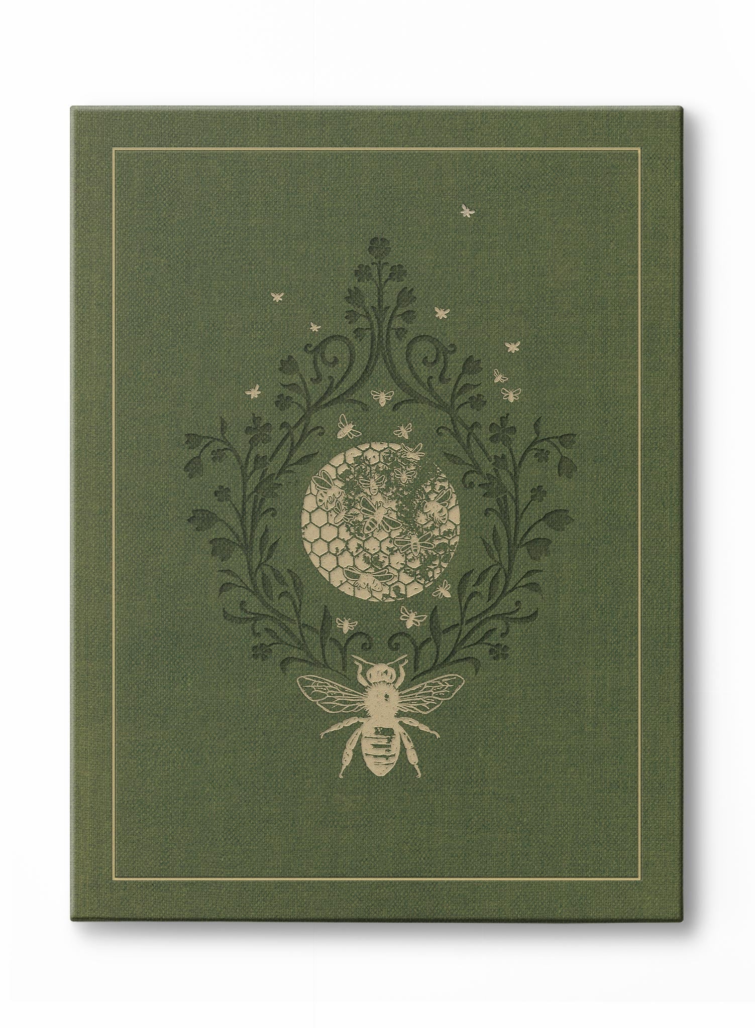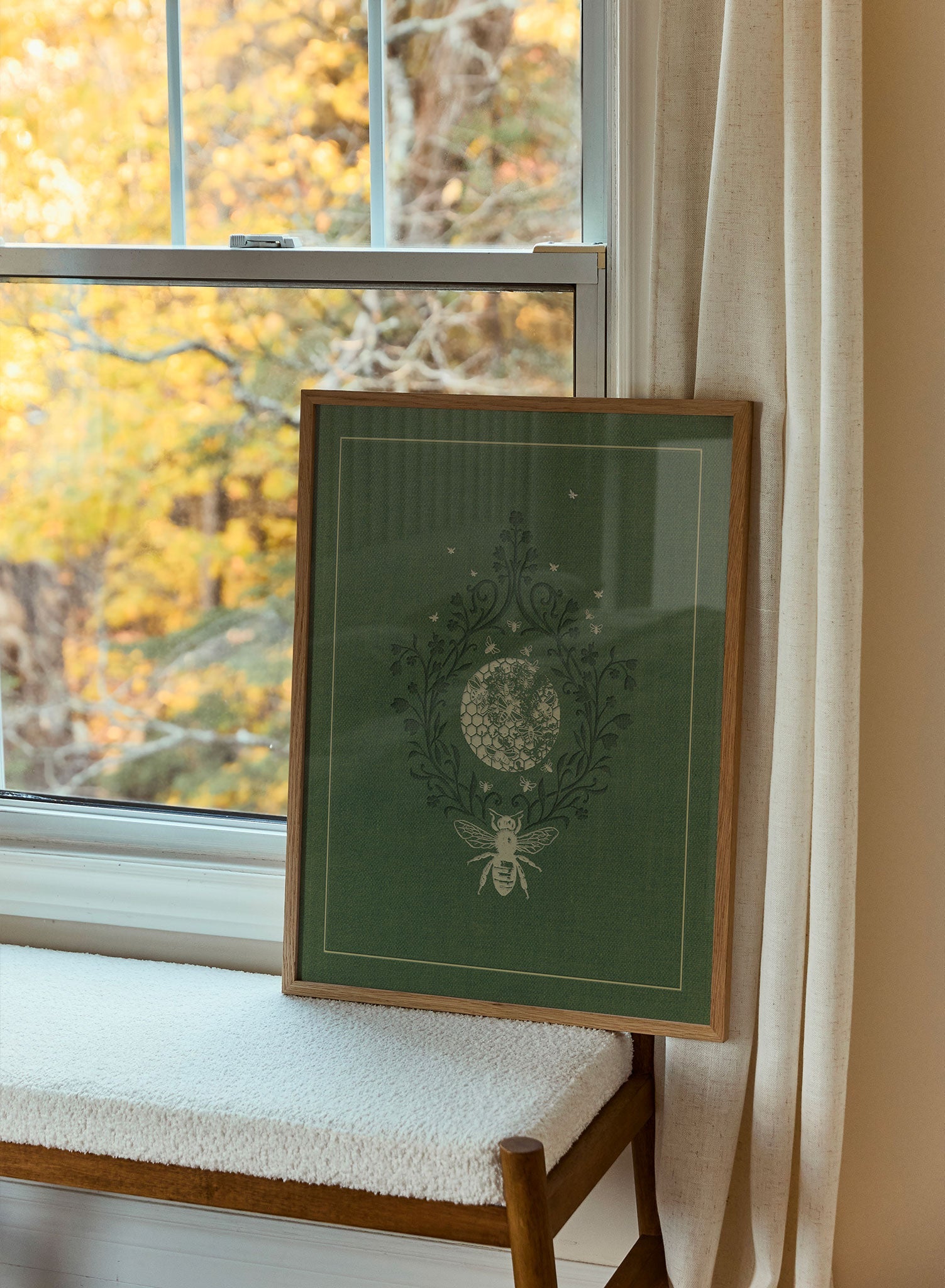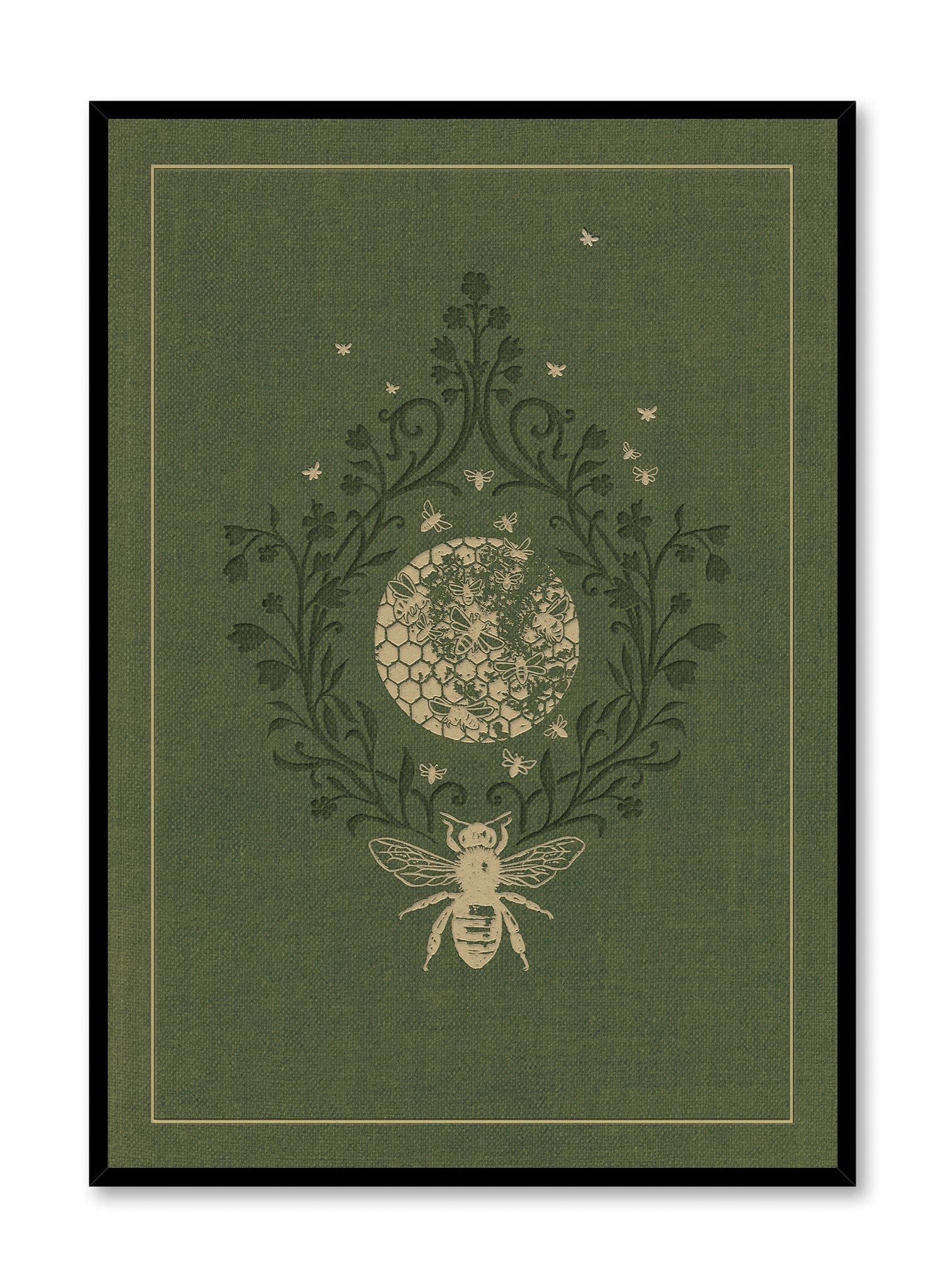 This captivating artwork features an intricate illustration of a bee hovering beneath a detailed hive surrounded by a halo of wildflowers and honeycomb patterns, set against a textured, deep green background. The delicate detailing of the foliage and flying bees adds movement and life to the design, while the golden accents lend an air of sophistication.