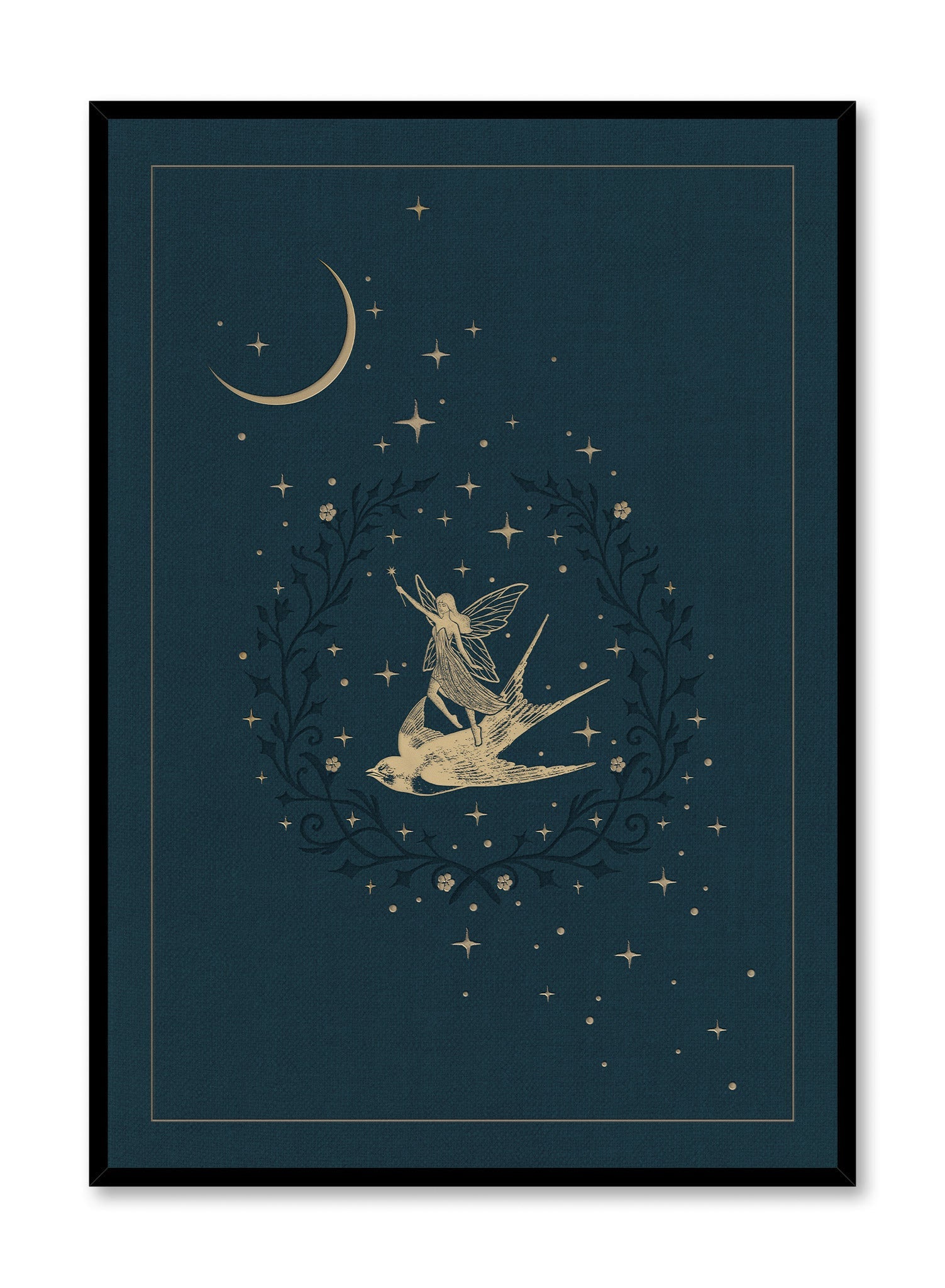 A whimsical fairy rides on the back of a graceful swallow, surrounded by golden stars and a crescent moon. Set against a deep teal background, this art print evokes a magical nighttime scene. The delicate golden linework and ethereal details make it a captivating focal point.